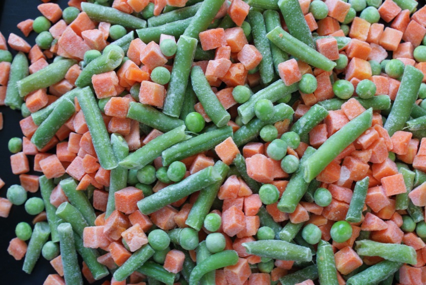 The iqf vegetable 3- way mix is prepared from separately deep frozen and carefully mixed ingredients such as carrots, cut beans, and garden peas.