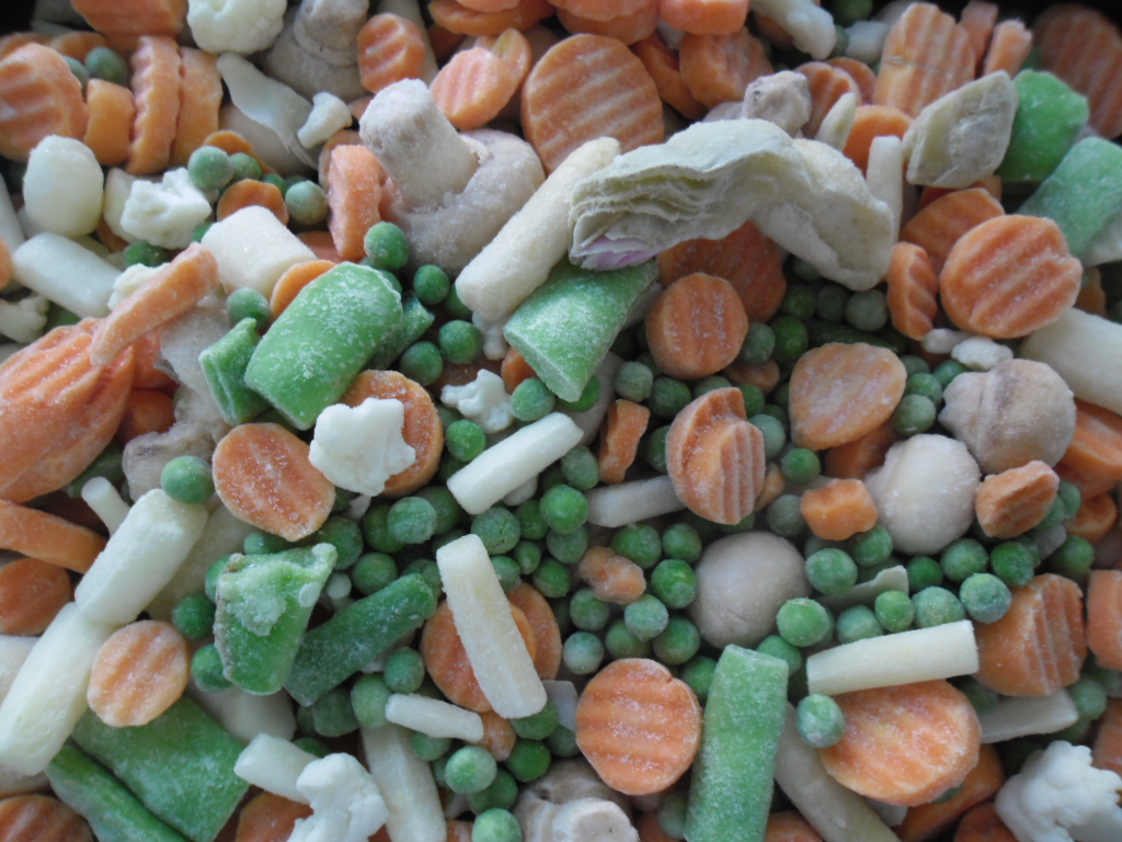 La mezcla de vegetales congelados " Menestra imperial" se prepara con los ingredientes congeldos por separado y se mezcla cuidadosamente: guisantes, habas, zanahorias, alcachofas, habas y coles de Bruselas.